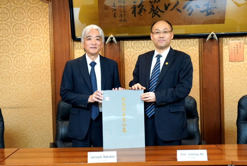 在一桥大学,马琰铭与中野聪(Nakano Satoshi)校长共同签署了两校新一期校际合作备忘录与学生交换协议。马琰铭介绍了浙江大学加快学科交叉融合的有关进展,并回顾了两校在师生交流、可持续发展等领域的合作情况。中野聪表示,希望进一步推动两校在社会科学与自然科学、工程学科等方面的交叉融合,拓展新的合作领域。